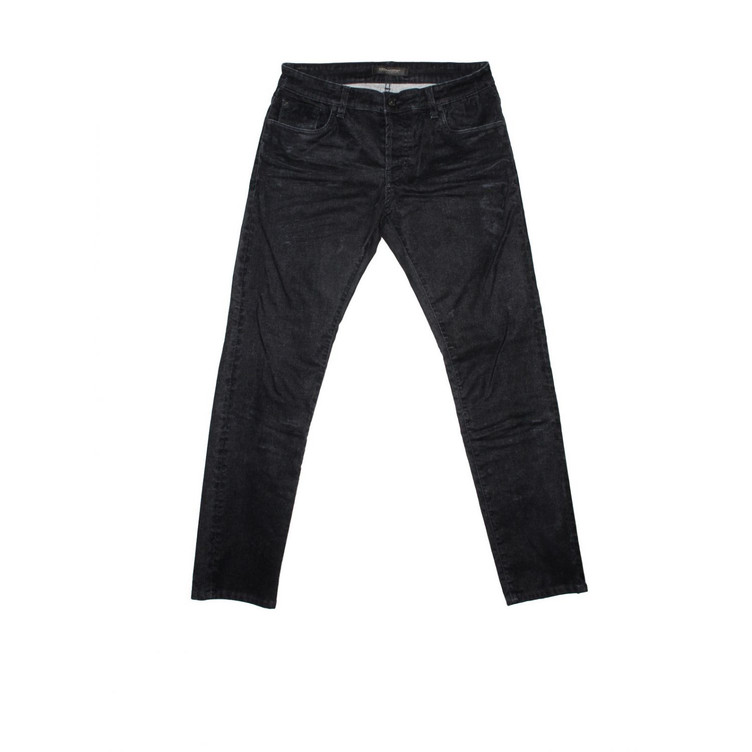 • FIVE POCKET JEANS IN FLOCKED, WASHED AND SCRATCHED DENIM